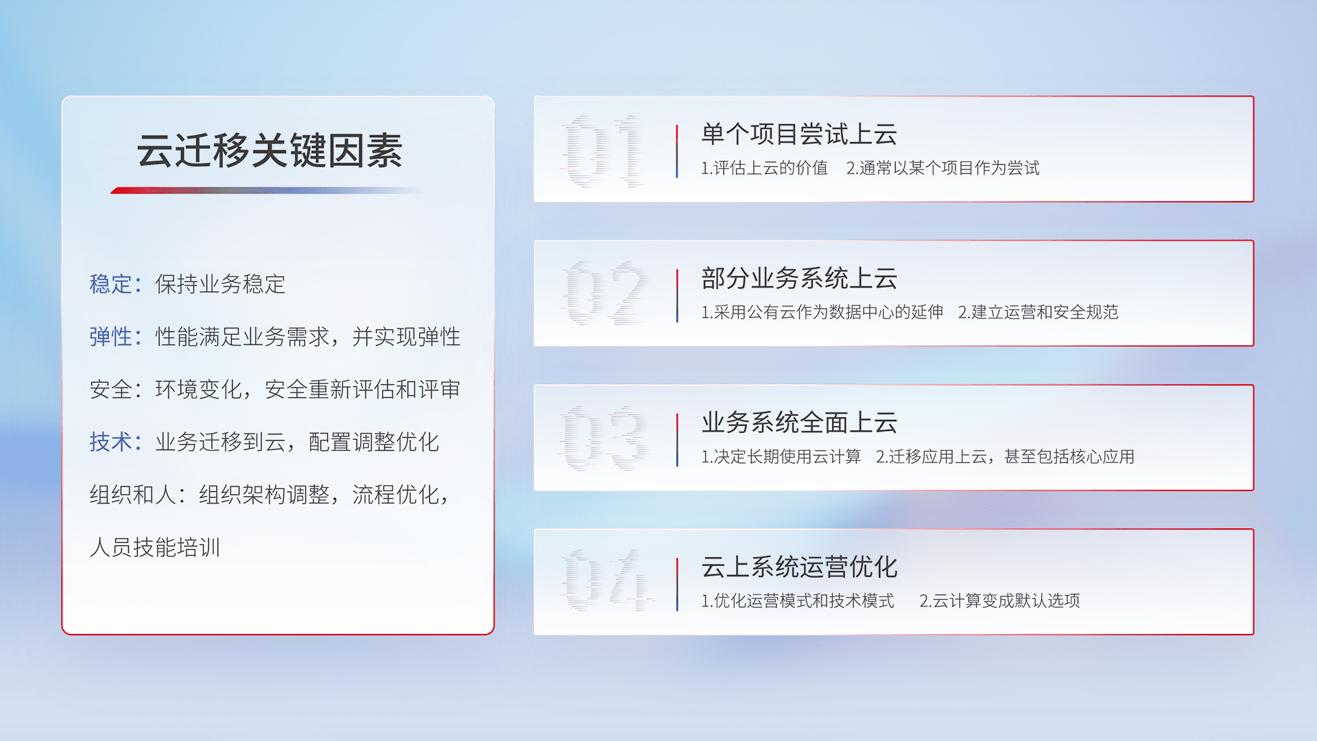 结合实际业务,,从规划设计、、、、云平台选型、、、、云原生改造、、、、数据迁移、、集成交付,,,迁移全过程为客户识别最佳上云路径,,,,做好风险识别管理,,设计网络架构、、身份权限、、、安全审计合规、、、操作审计、、、日志审计、、、监控告警策略、、多站点容灾设计等,,对云上基础设施进行整体规划,,提升IT治理水平,,,,以满足弹性、、、、高可用、、、、高性能的需求。。。