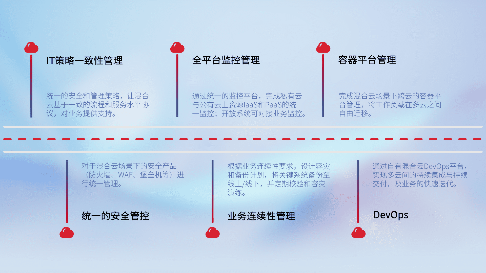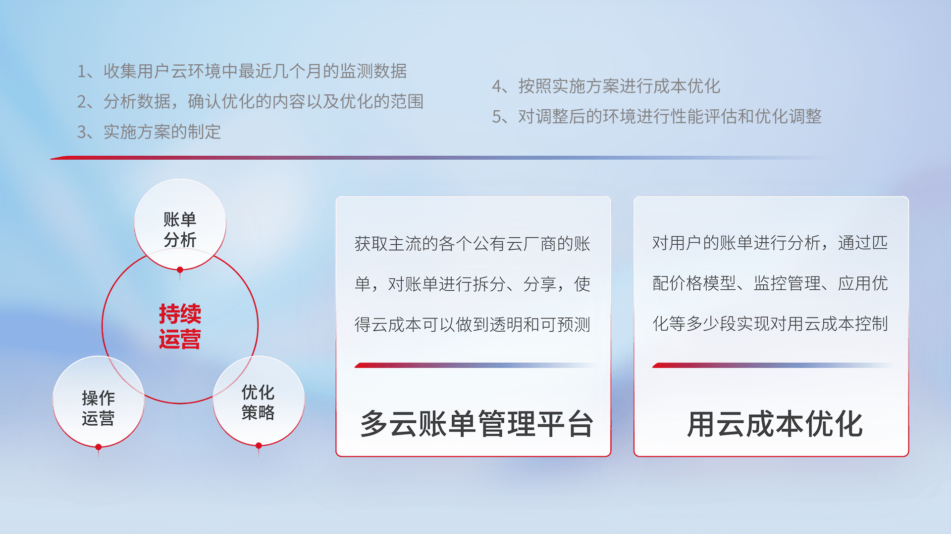 通过多云纳管,,,以统一的资源数据模型把客户的云资源进行抽象和封装,,,,进而实现对多云资源的统一操作,,保障云资源管理的可靠性、、稳定性与可用性。。量身定制化运维内容,,配置、、、、开发运维、、、、补丁管理、、备份、、监控、、认证和访问管理、、、、审计和日常巡检等,,,保障在用云过程中的可靠度,,,,稳定度以及高可用率。。。。